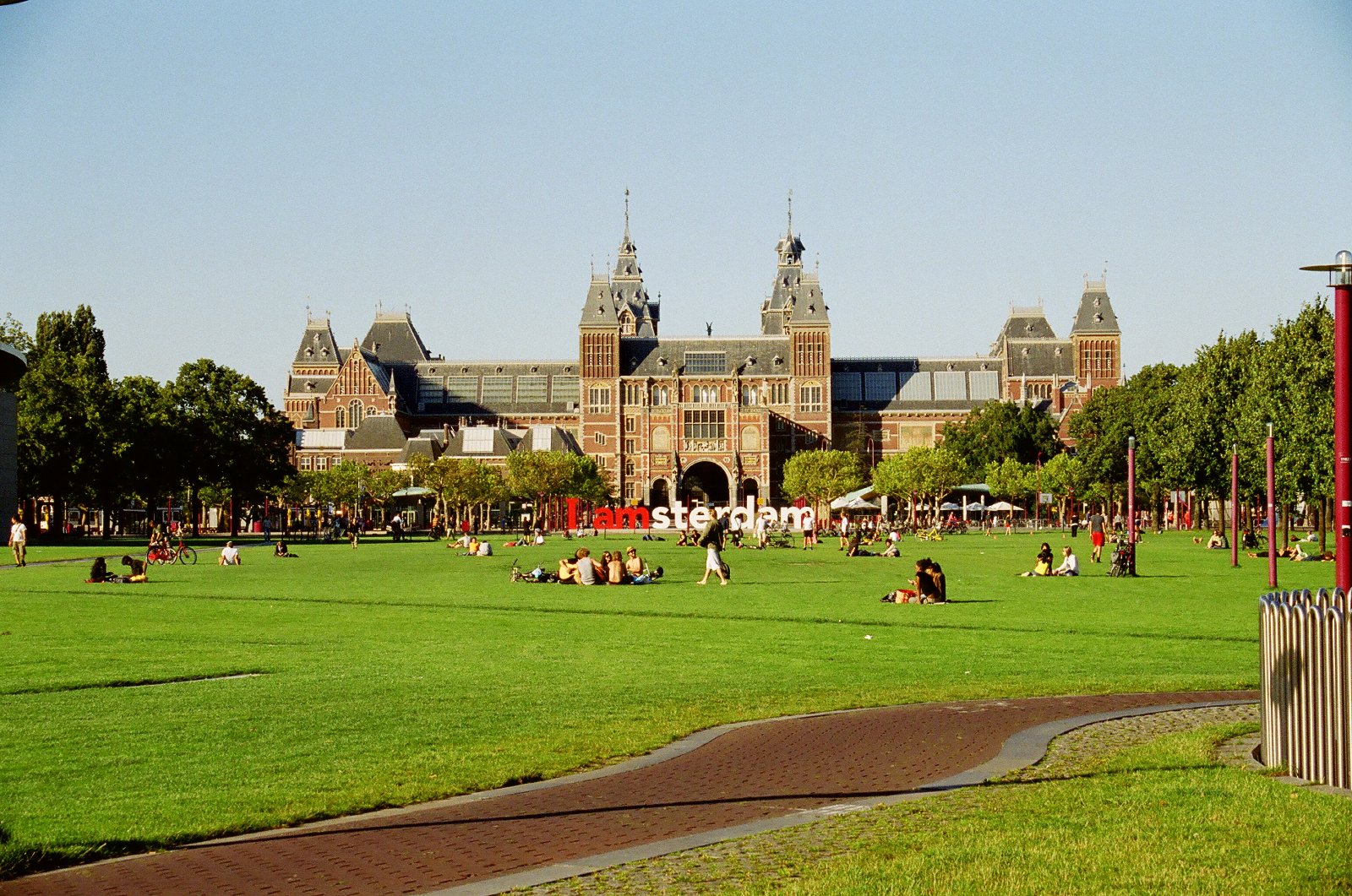 From the bottom of the museum plein, the Rijksmuseum and the 'IAMSTERDAM' installation. Netherlands.