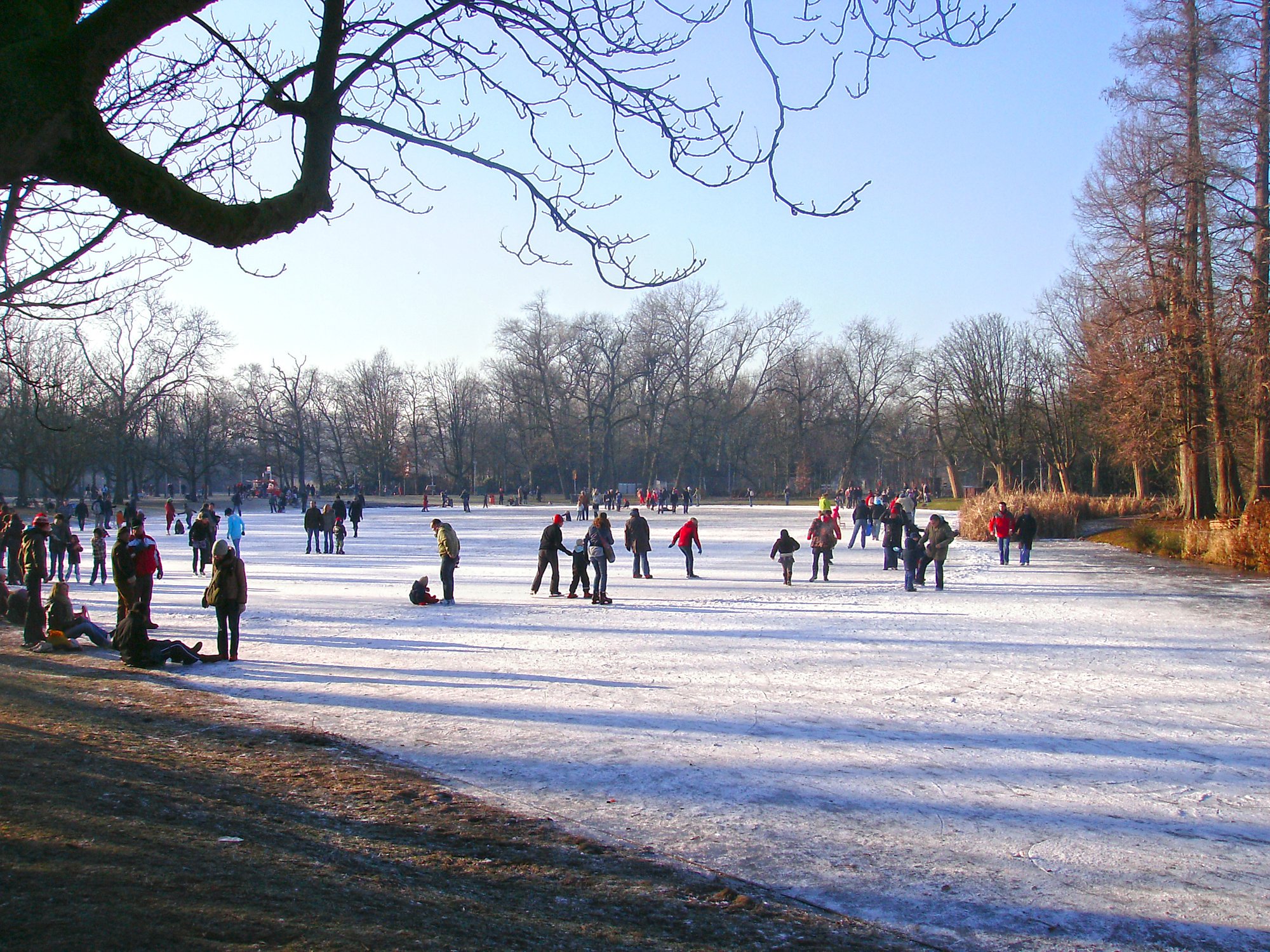 A scene that is becoming rare, the main big lake of Vondelpark completely frozen. Amsterdam, Netherlands.
