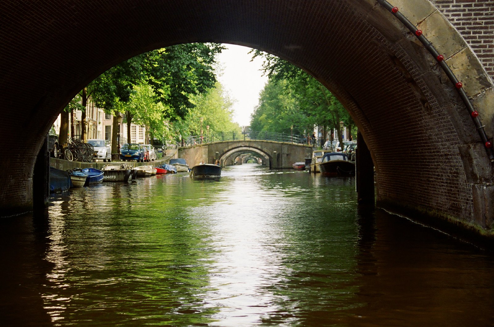 Aligned bridges during boat ride. Common view in Amsterdam, Netherlands.